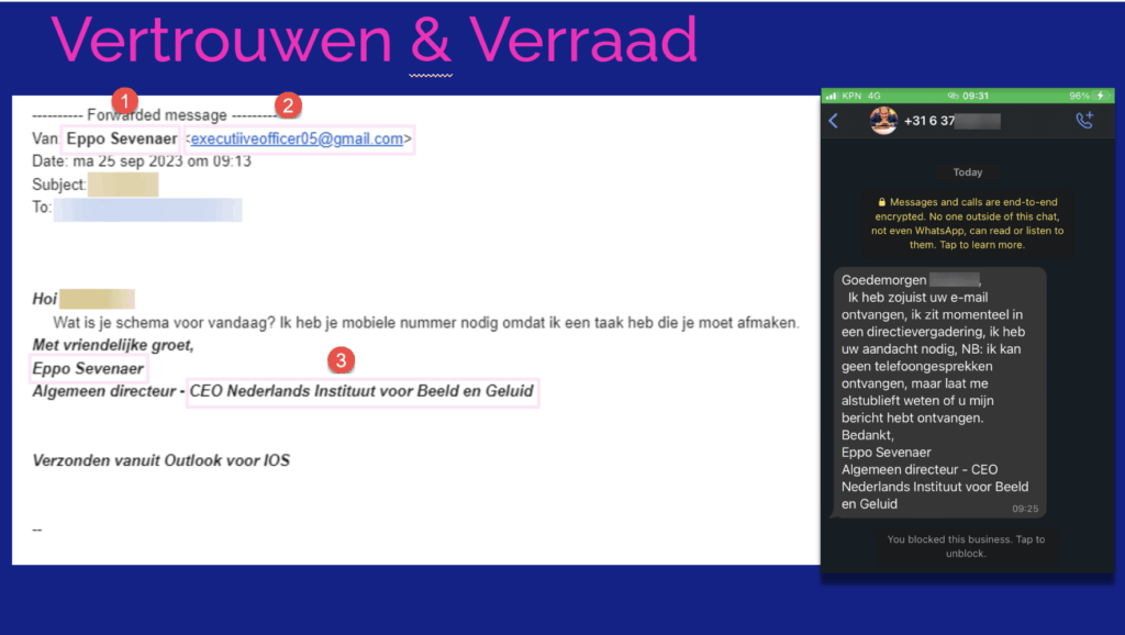 De urgentie rond cyberveiligheid is groot. Fransen verwijst naar recente incidenten, zoals een hack bij de British Library en een incident bij Beeld & Geluid waarbij een phishingmail en what’s app bericht uit naam van de directeur rondging. Resi Hesseling van Juridische Zaken van Beeld & Geluid geeft een toelichting op het incident en vertelt over de directe actie die de organisatie heeft ondernomen.